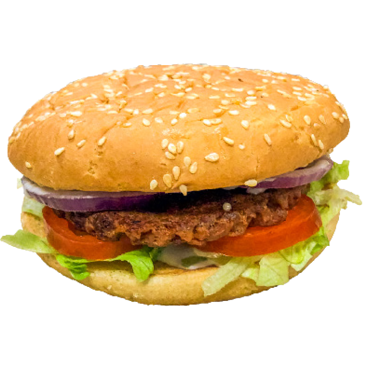Pihvi, raikas salaatti, tuoretta tomaattia ja maistuva majoneesi muhkean hampurilaissämpylän välissä.